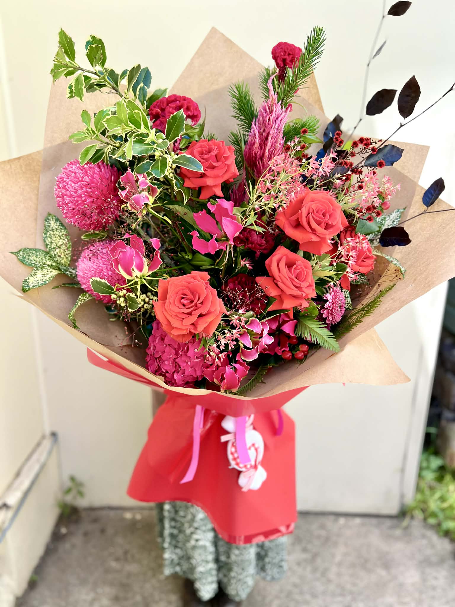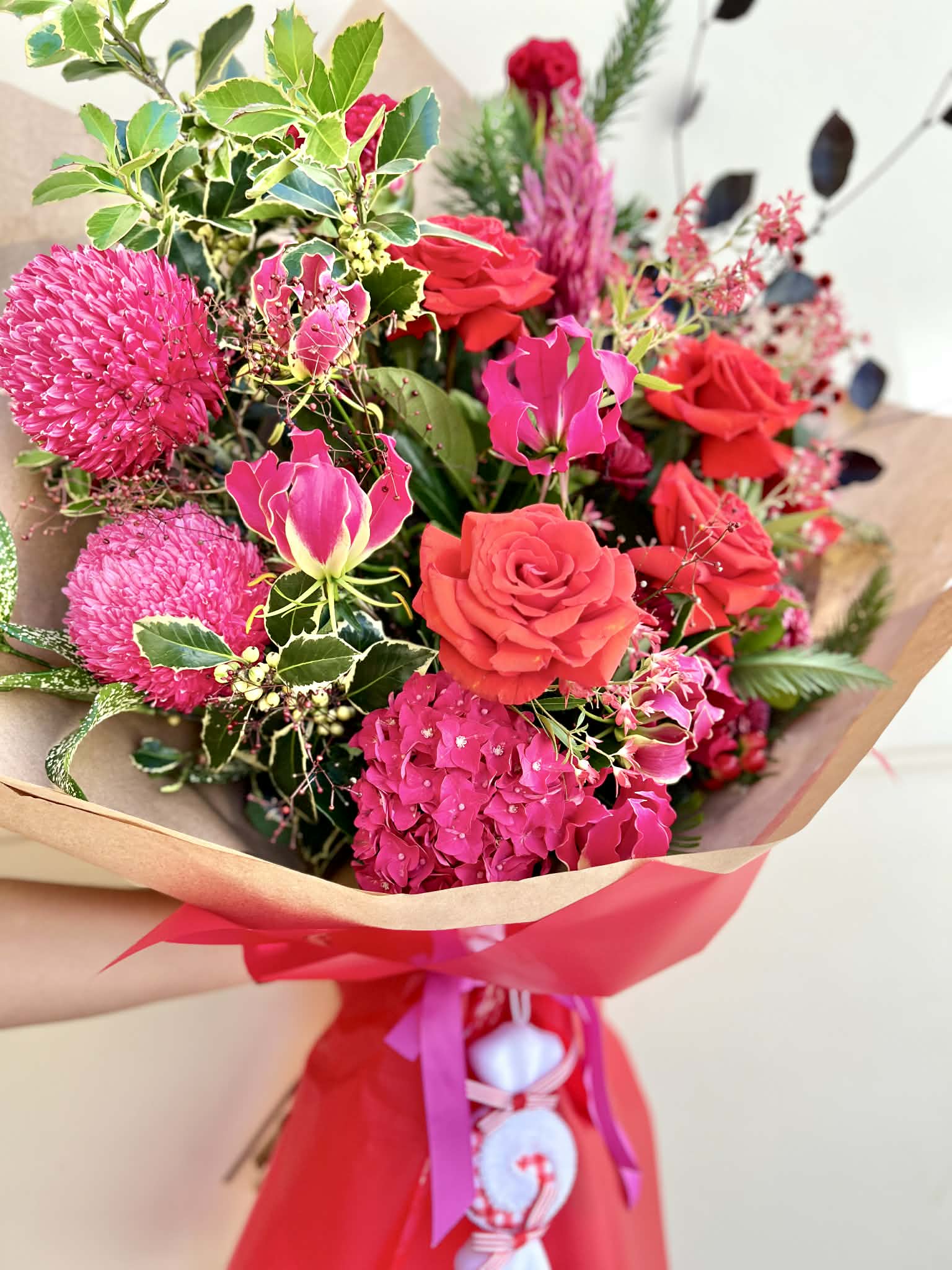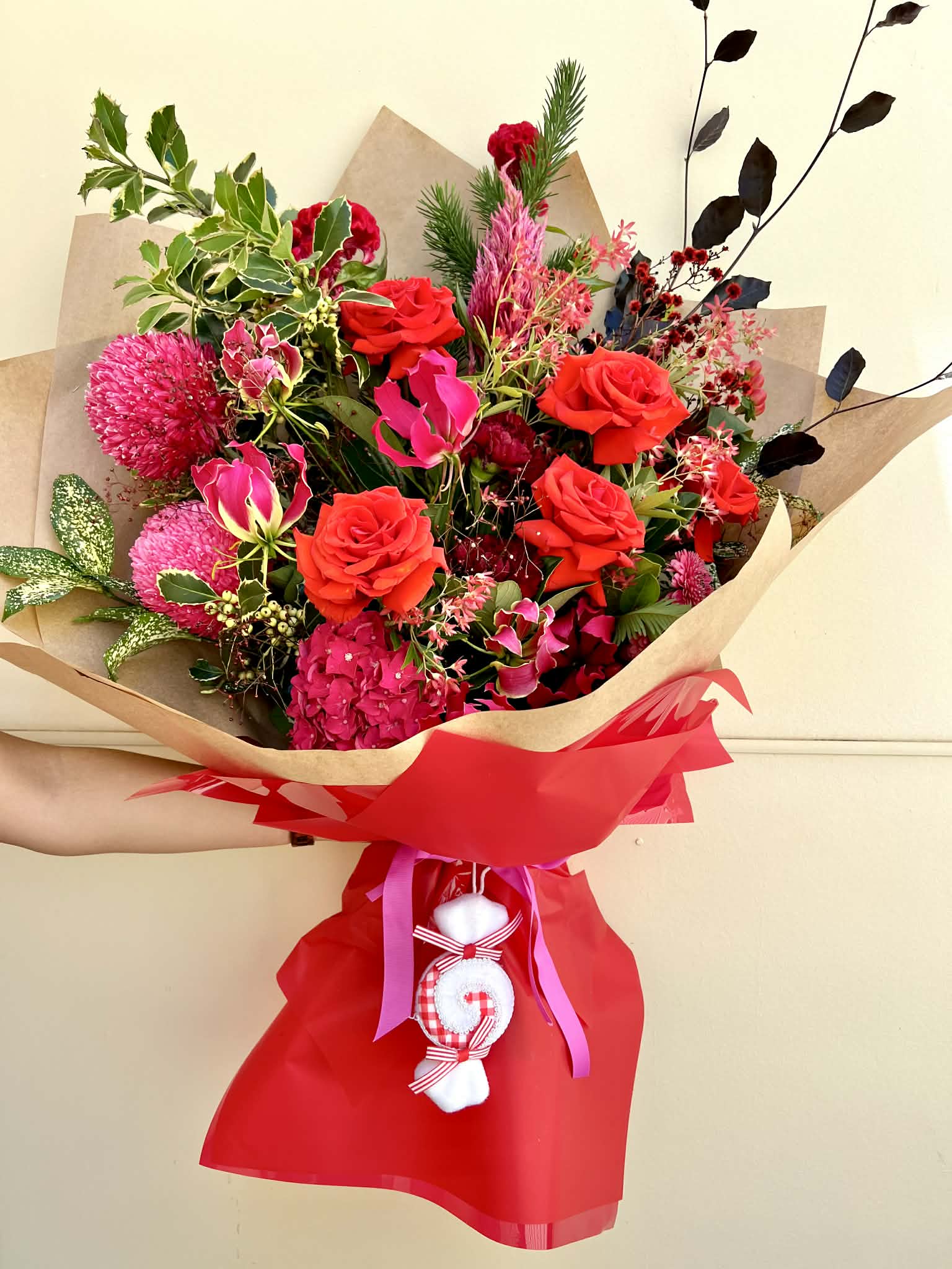 Introducing Candy Cane Kiss, a vibrant and joyful addition to Shique Floral Design’s Christmas Collection. Bursting with rich reds, playful pinks, festive natives, and luxurious roses, this bouquet brings the fun, colourful side of Christmas to life. Designed to stand out, Candy Cane Kiss blends bold seasonal blooms with lush greenery and whimsical textures, creating a bouquet that feels both enchanting and delightfully sweet. Finished with a charming candy-themed accent, it adds an irresistible touch of festive cheer — perfect for gifting, decorating, or brightening someone’s holiday season.