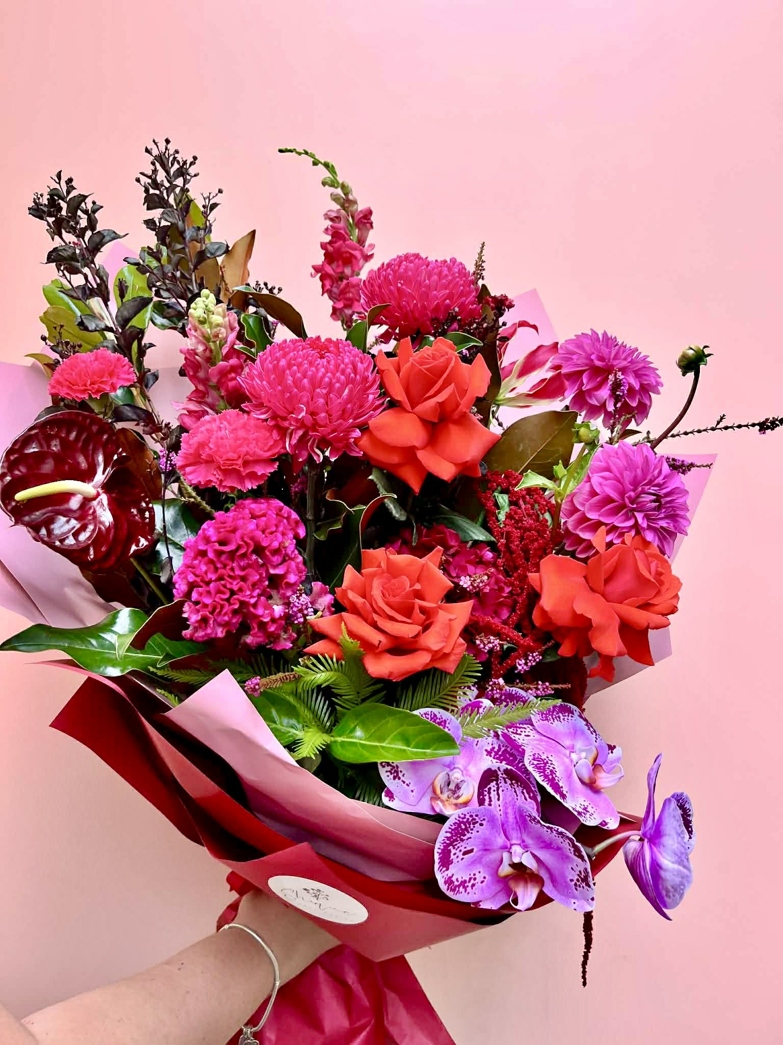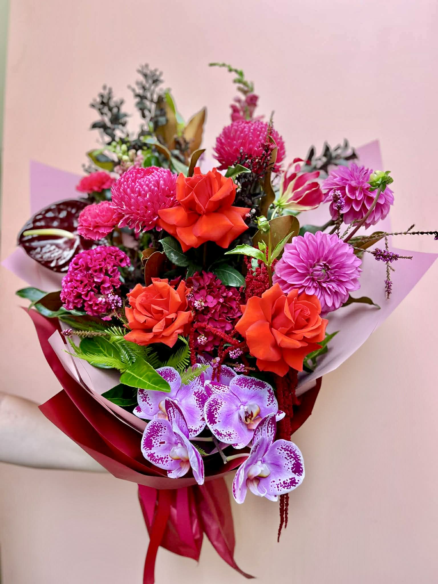 This captivating arrangement features premium blooms in rich tones of deep red, crimson, magenta, and deep pink, layered with lush foliage and finished with dramatic orchid accents. Textural, bold, and beautifully unrestrained, each stem is thoughtfully placed to create movement, contrast, and an undeniable sense of allure.